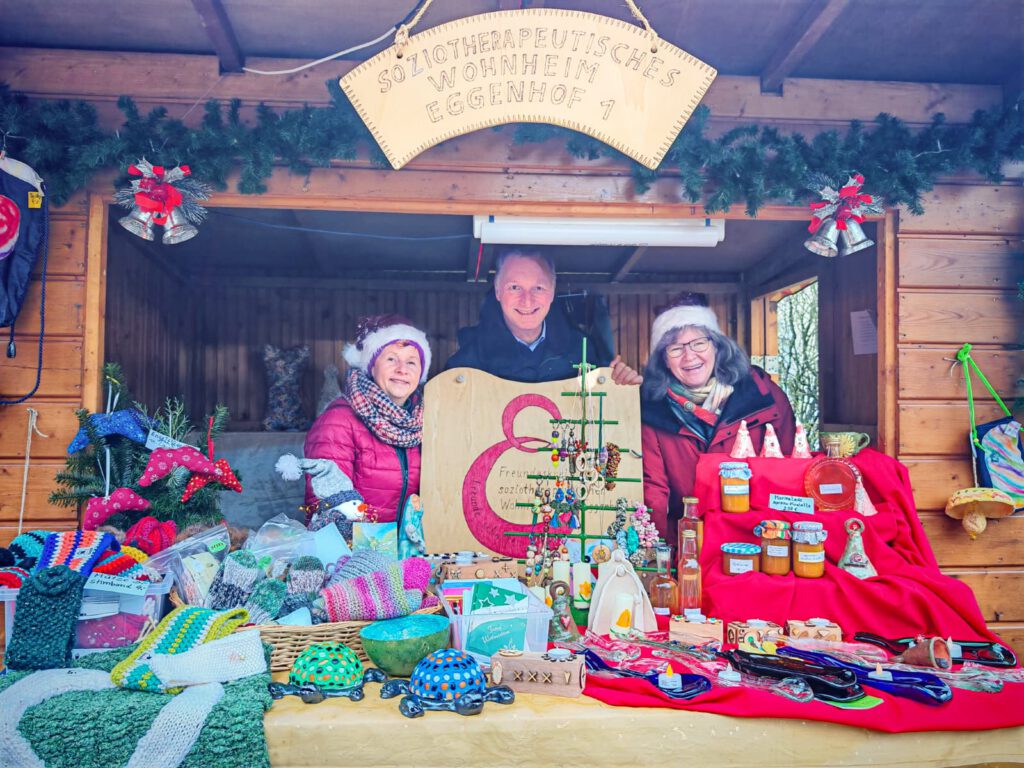 Das Soziotherapeutische Wohnheim Eggenhof und der Freundeskreis des Wohnheimes konnten am Sonntag eine „Hütte“ bestücken. Fleißige Mitglieder des Freundeskreises hatten Marmelade, Quittenlikör, gestrickte Mützen und Schals, sowie genähte Accessoire für den Verkauf gespendet. Das Wohnheim stellte Arbeiten aus Ton und Glas, und gewebte Stuhlkissen, hergestellt in der Beschäftigungstherapie, ebenfalls zum Verkauf.