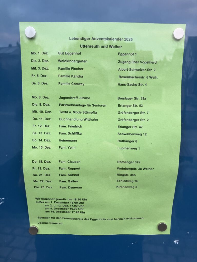 So schön, dass die Tradition eines lebendigen Adventskalendersin Uttenreuth weiter gepflegt wird. Noch schöner, dass gleich das erste Türchen bei uns im Eggenhof geöffnet wurde.